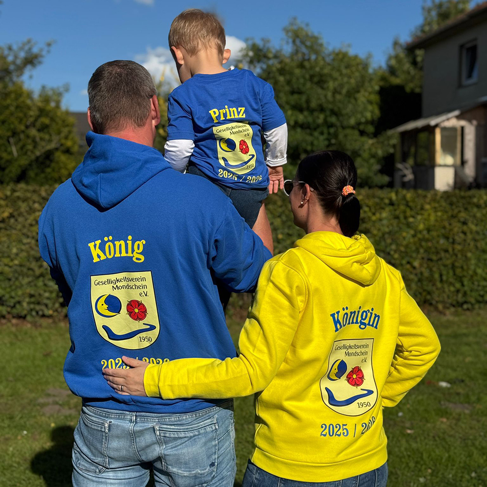 Für das Königspaar Hubi & Sarah vom Hofstaat am Mondschein durfte es keine klassischen Shirts sein – sondern Hoodies und T-Shirts im blau-gelben Farbkonzept. Wie gewohnt in bester Qualität haben wir den gesamten Hofstaat ausgestattet, sodass die Stimmung sichtbar wird.